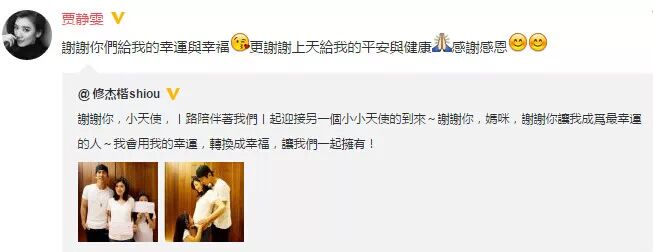 随后,贾静雯也转发了修杰楷微博称“谢谢你们给我的幸运与幸福,更谢谢上天给我的平安与健康,感恩。”女神如愿找到幸福,粉丝也纷纷留言祝愿,不少网友还跑到修杰楷微博下留言,“一定要好好对待女神,祝你们一家永远开心。”