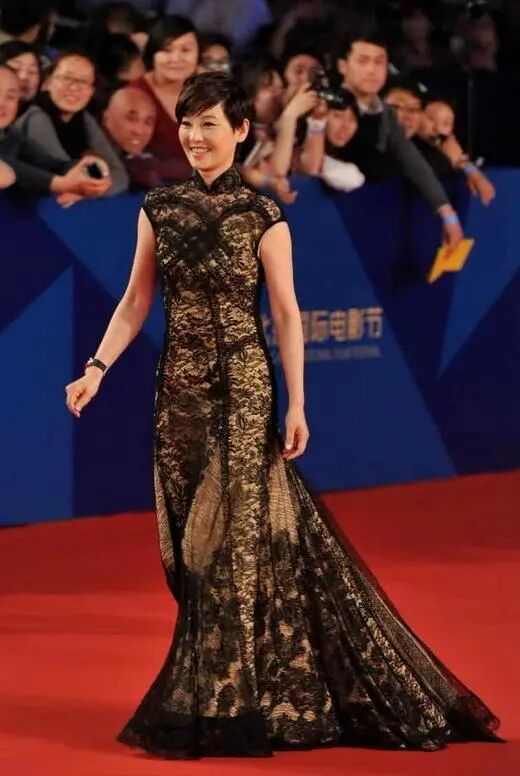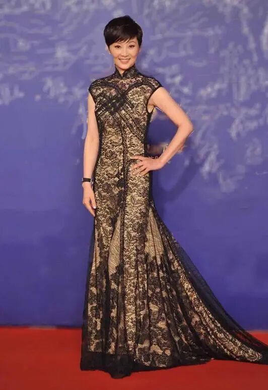 拖地的鱼尾大裙摆遵循上紧下松的穿搭原则,是套十分聪明的穿搭公式,论旗袍在女明星身上出现的次数,巩俐早年出席活动基本都是旗袍,随便挑出来一身给人的感觉都是大气端庄,气场强大,这都取决于巩俐的大骨架以及很好的臀腰比,而徐帆的身材虽然丰腴,但是骨架并不是特别大,臀腰比例也不是那么突出,所以利用鱼尾裙拖地大裙摆,衬托出自己的腰线将劣势转化为优势。