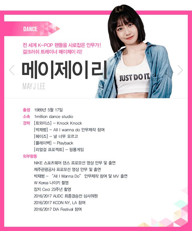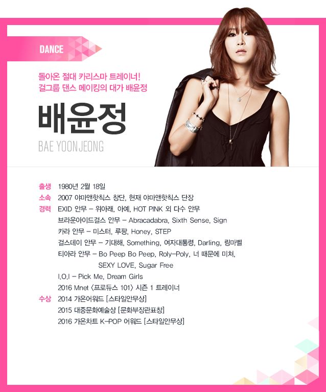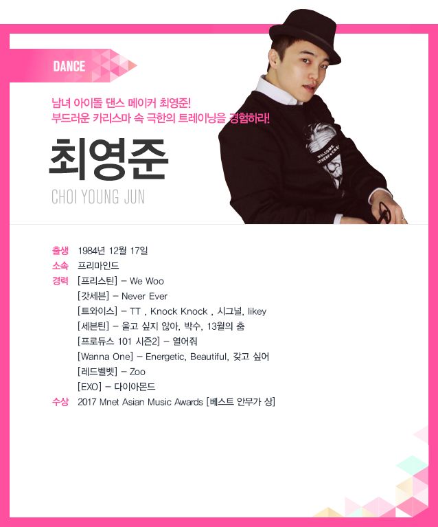 以及舞蹈导师崔永俊,曾凭借Seventeen《Don't Wanna Cry》和Wanna One《Beautiful》在“2017年Mnet亚洲音乐大奖(MAMA)”中获得最佳编舞家奖项。