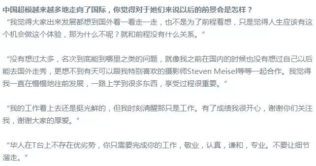她是第一位也是目前唯一一位走过六大蓝血品牌(Dior、Chanel、Louis Vuitton、Gucci、Prada、Calvin Klein)的T台的国模。