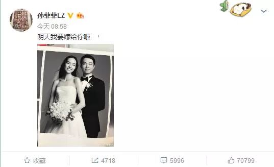 今天,超模孙菲菲在微博晒出了一张结婚照,并兴奋地配文:明天我要嫁给你啦。