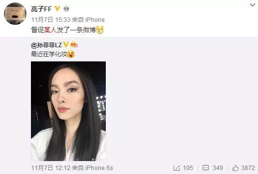两人还常常暗戳戳地在微博上互动,亮子称呼孙菲菲为“某人”。