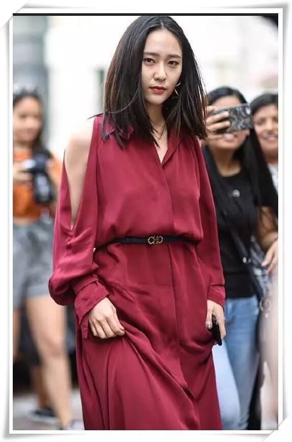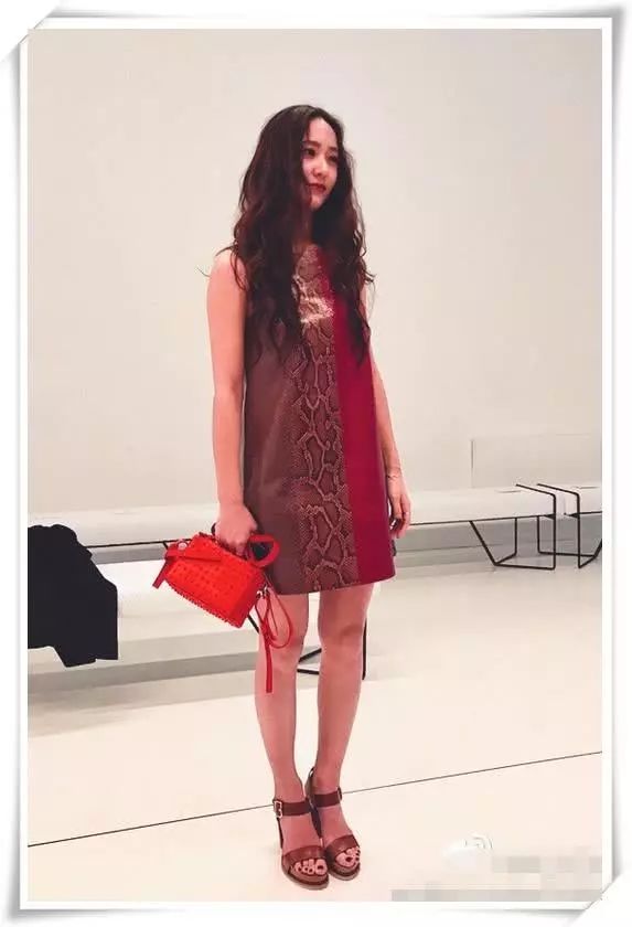 这次的郑秀晶有点温柔啊,虽然还是带着与生俱来的高冷气息,穿了一件红色和棕色拼接的连衣裙,脚上是一双红棕色高跟鞋,看起来有点温柔的感觉了呢。