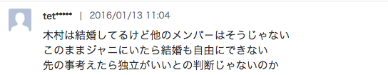 团员里除了木村其他团员都没结婚,如果继续在SMAP里面的话,不能结婚也没有自由,所以这应该是考虑到未来而做出的判断吧。