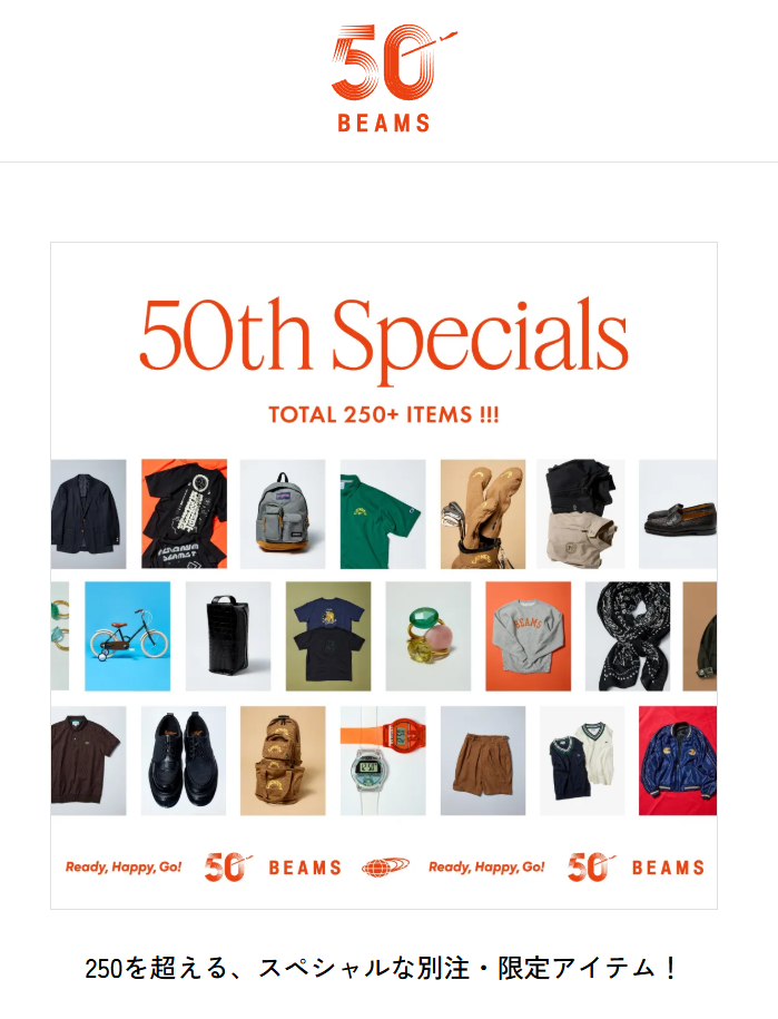 BEAMS 迎来创立五十周年,正式公布周年纪念计划,三大支柱包括海外扩张、新品牌业务及二手商品销售。3 月 3 日,翻新后的 BEAMS 原宿旗舰店重新开业,拉开周年序幕。为庆祝五十周年,BEAMS 还将携手 30 余个品牌推出 250 款联名纪念商品,现已于官网完整公开。