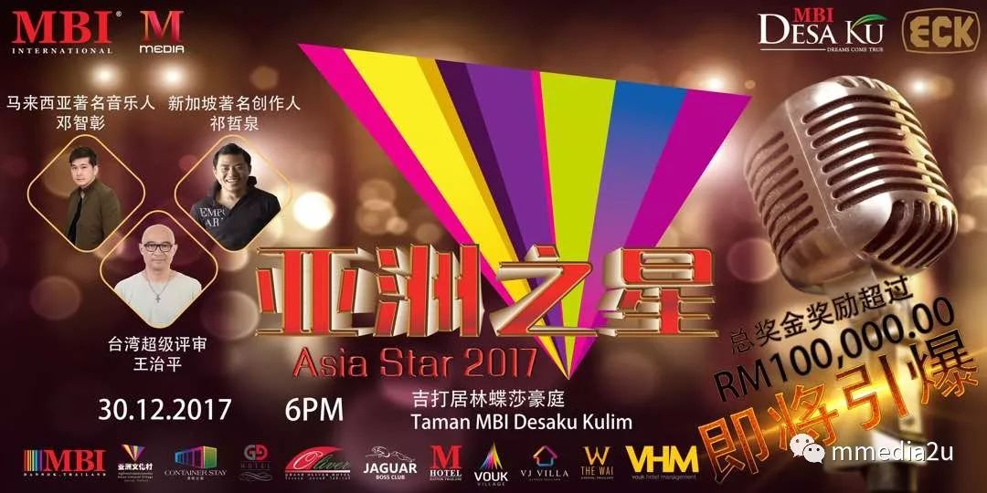 集合中国、台湾、香港、澳门、新加坡、印尼和马来西亚等地唱将,高达逾10万令吉丰富奖金奖励的“2017年亚洲之星”总决赛,将于12月30日傍晚6时在吉打居林蝶莎豪庭隆重举行。