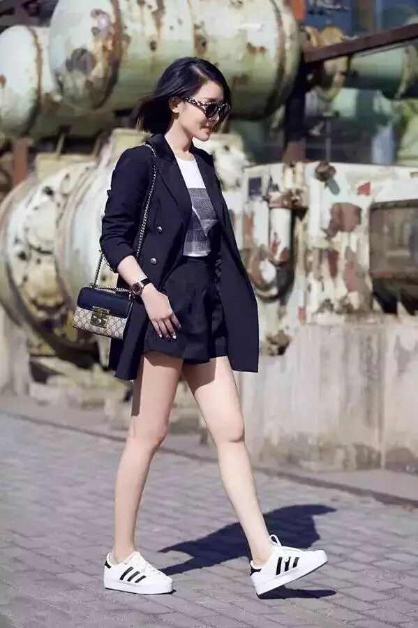 还可以穿黑色薄款西装搭配高腰短裤,内搭普通白T恤,脚踩白色休闲鞋,随性打扮总攻气十足。