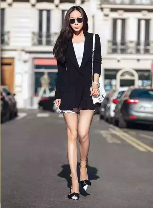 白色小西装搭黑色短裤,经典的黑白搭配,脚踩尖头高跟鞋,知性OL范十足。