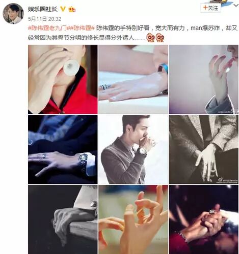 5月11日,有网友总结了一组陈伟霆手部特写照片,并配文称“陈伟霆的手特别好看,宽大而有力,man爆苏炸,却又经常因为其骨节分明的修长显得分外诱人”。这组照片,既有霸道总裁风格的,也有温馨暖男风格的,充分表现出陈伟霆手的特点,骨节分明,修长温暖,手指的“W”纹身更是经常被笑称自带防伪标识。对此网友纷纷表示:“可帅可酷可萌可动感,一个陈伟霆,给你超多百变的完美打开方式。男神陈伟霆不止颜值超高,手也超好看!”,“作为一个手控,面对陈伟霆这双man爆了的手简直无法冷静!”