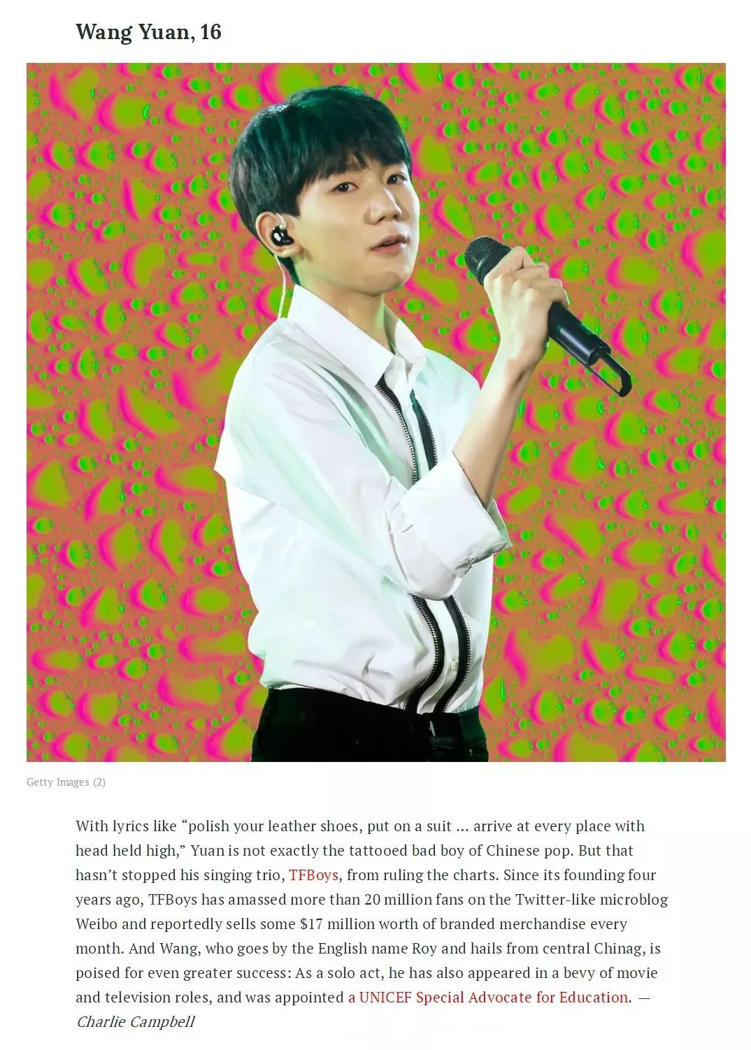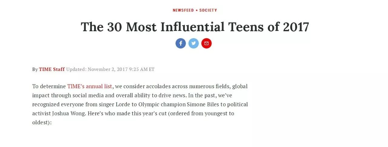 《TIME时代周刊》评选出了30位年度最具影响力的青少年,还未满17岁的王源凭借巨大的号召力及联合国儿童基金会青年教育使者等身份成功入选。
