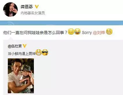 导演伍仕贤8月17日在微博上晒出一张自家萌娃和演员吴彦祖的欢快合影,笑称是“小鲜肉遇上男神”。照片中,男神吴彦祖和混血激萌的小Chase相处融洽,一大一小乐不可支的模样看得人心情大好。随后,伍导的太太,女星龚蓓苾也转发了这有趣的一幕,搞怪表示“他们一直在问我娃娃亲是怎么回事?”,并@刘烨。这让网友们迅速兴奋回复称,“之前社长(刘烨)一直缠着和蛋妞(吴彦祖)结娃娃亲,但现在看来男神和Chase似乎更有翁婿脸呢!社长这回又要哭晕在厕所了!”