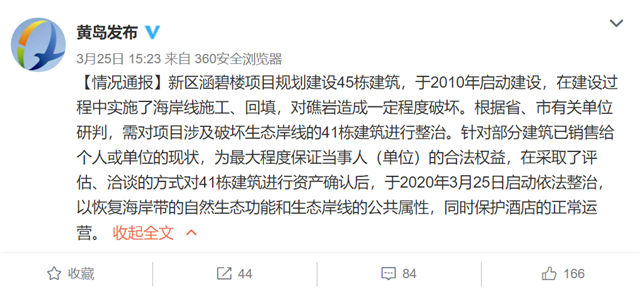 该媒体指出,当地政府已经向购房者进行了沟通洽谈,目前,官方在酒店正常运行的情况下进行了拆除工作,并且承诺会尽快恢复海岸带的自然生态功能和生态岸线的公共属性。