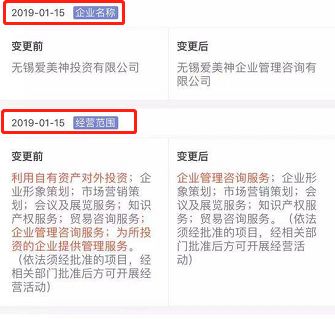 同一天,爱美神公司的企业名称和经营范围都发生了改变。