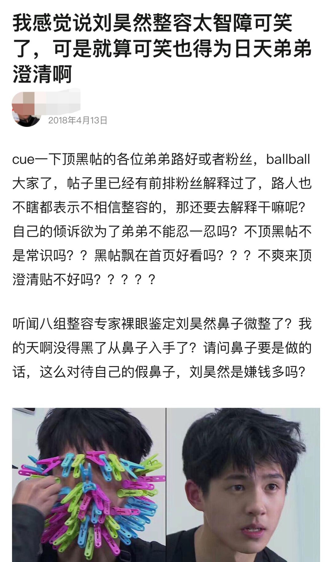 之前就有发过澄清贴,里面贴出了很多刘昊然这几年的照片,各个角度鼻子的对比。