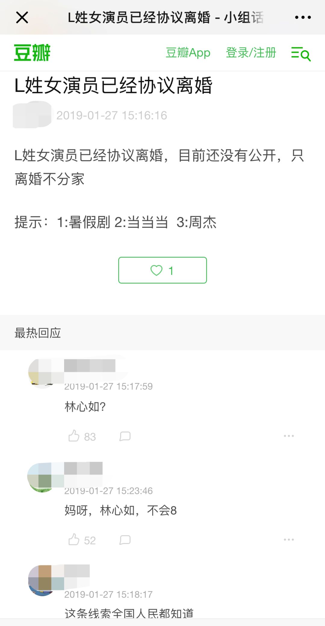 其中提示都明显指向林心如,评论中也都在猜是林心如。
