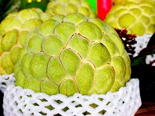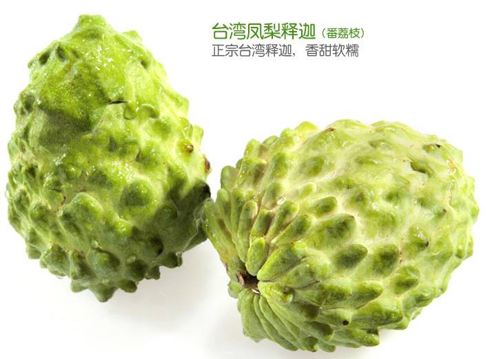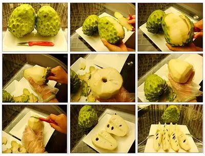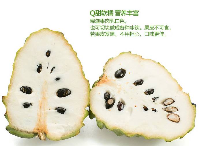 PS:释迦果未软熟前绝不可放入冰箱冷藏,否则将变黑变硬。吃法大概就像吃西瓜一样,纵向剖开后切片食用。