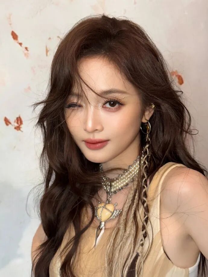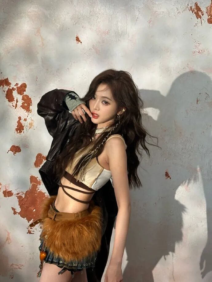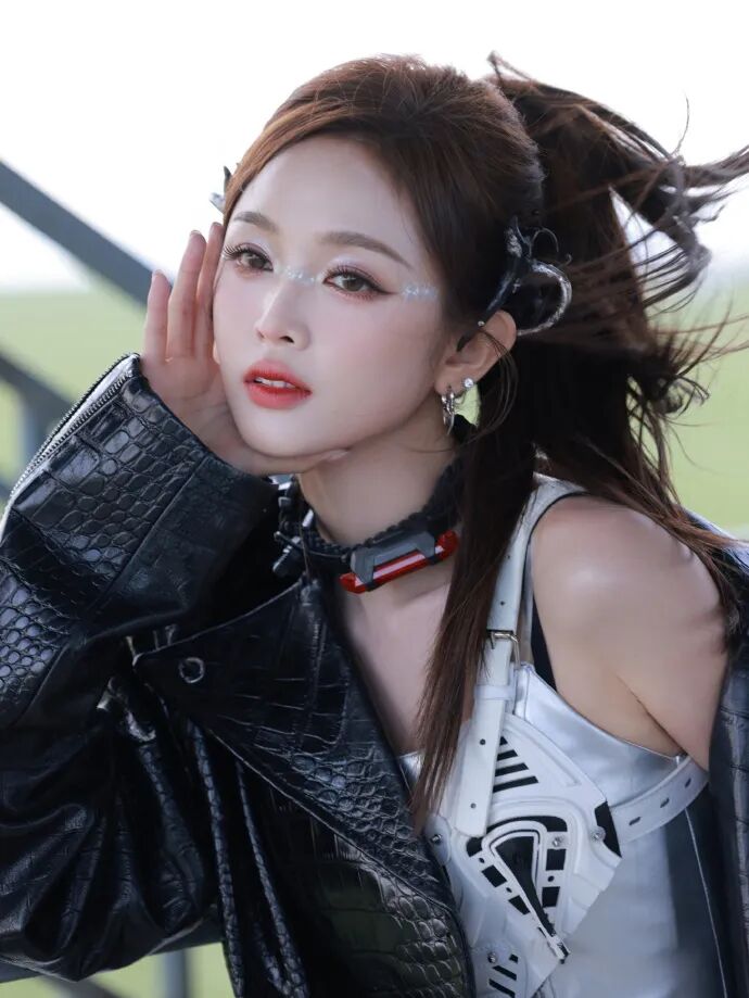 皮衣外套和超吸睛的项链,搭配亚裔感流浪妆容,独属于吴宣仪的流浪辣妹感扑面而来。