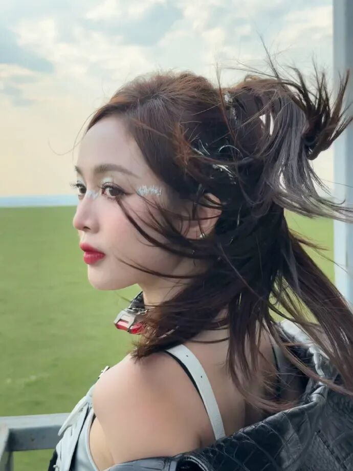 鼻梁上银色的横线和眼影的截断与衣服相呼应,面饰的金属冰冷感与整体呼应,塑造吴宣仪的赛博朋克风。