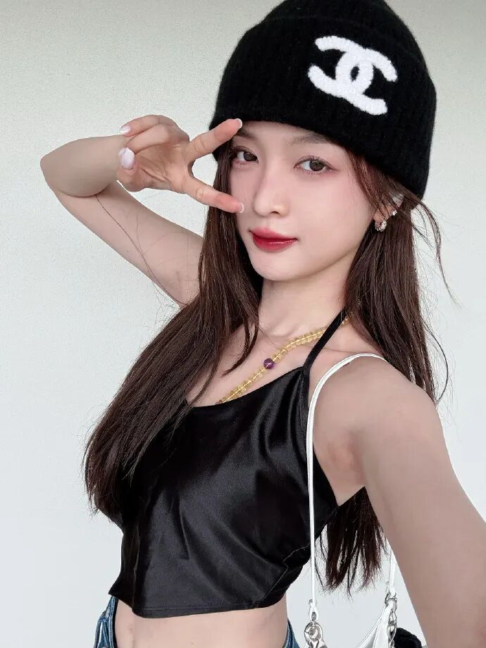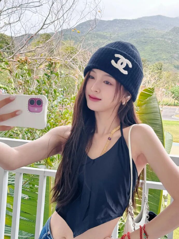 搭配香奈儿大logo的帽子和黄色珠子饰品,在穿搭中增加自己的特色和小巧思。