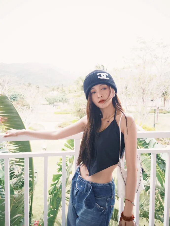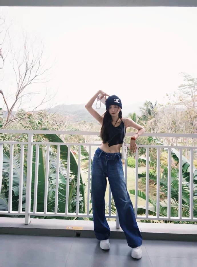 黑色背心搭配牛仔裤和白鞋,基础穿搭毫不费力的展现出吴宣仪的美丽。