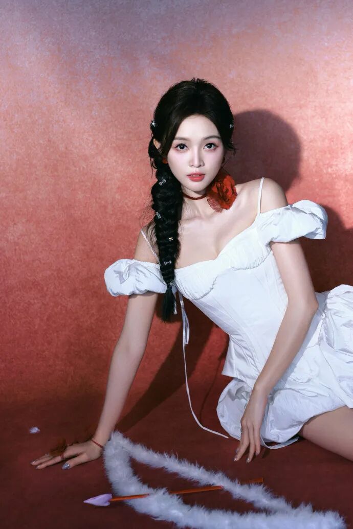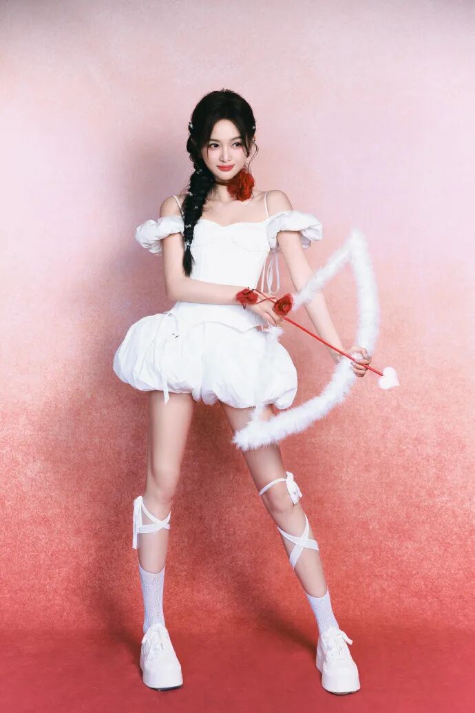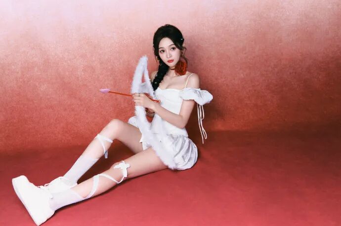 红色渐变的背景和丘比特之箭的道具都和服装相配合,整体甜辣又妩媚。