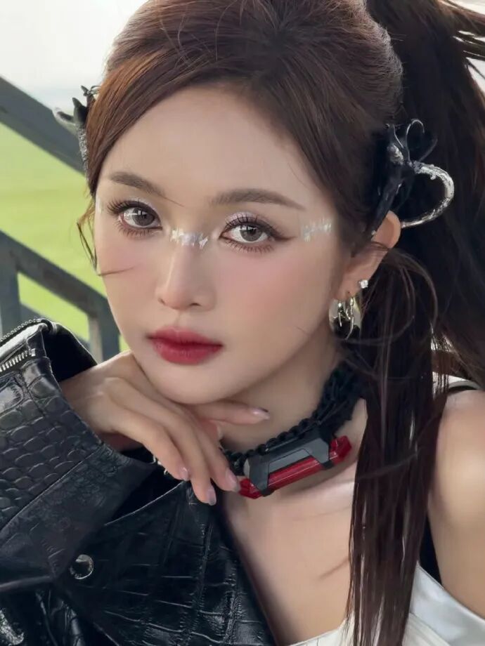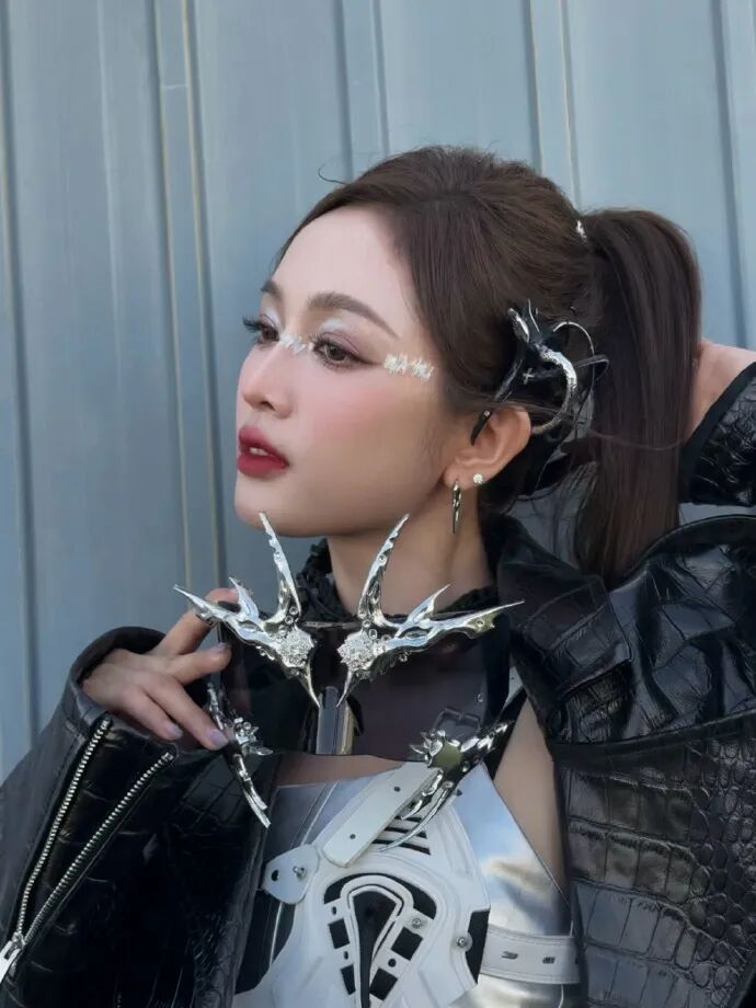 塑造冷漠感和立体五官的基础妆容,搭配银色系赛博朋克妆容和配饰,与高马尾一起塑造AI感。