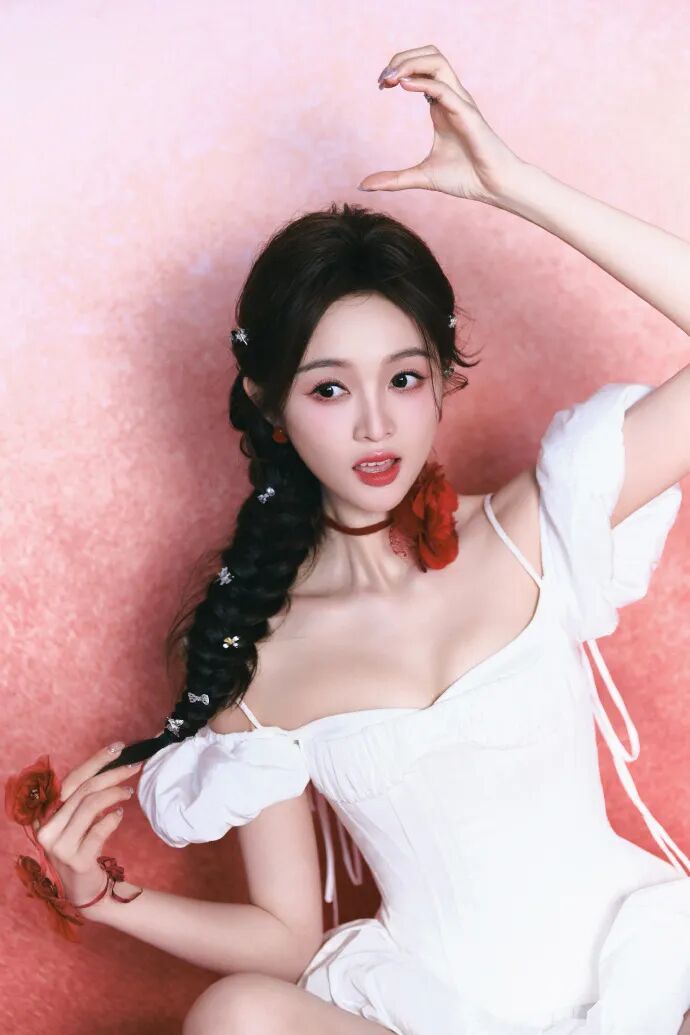 侧马尾麻花搭配红色花朵chocker,在纯白服装下显得格外艳丽,妩媚感混杂在甜辣感中间。