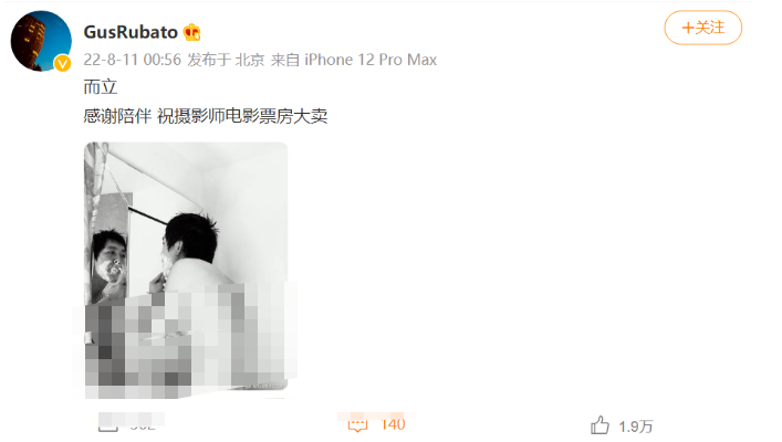 “而立,感谢陪伴,祝摄影师电影票房大卖”。