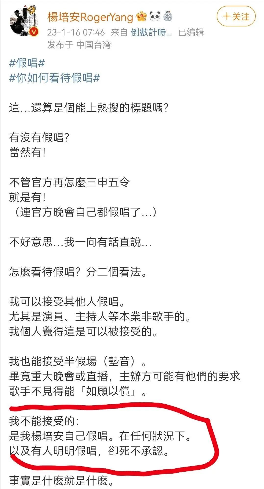 其次,杨培安表示可以接受非专业歌手假唱,也可以接受歌手半假唱,唯独不能接受“明明假唱却死不承认”的做法,他自己无论在何种情况下都不会假唱。