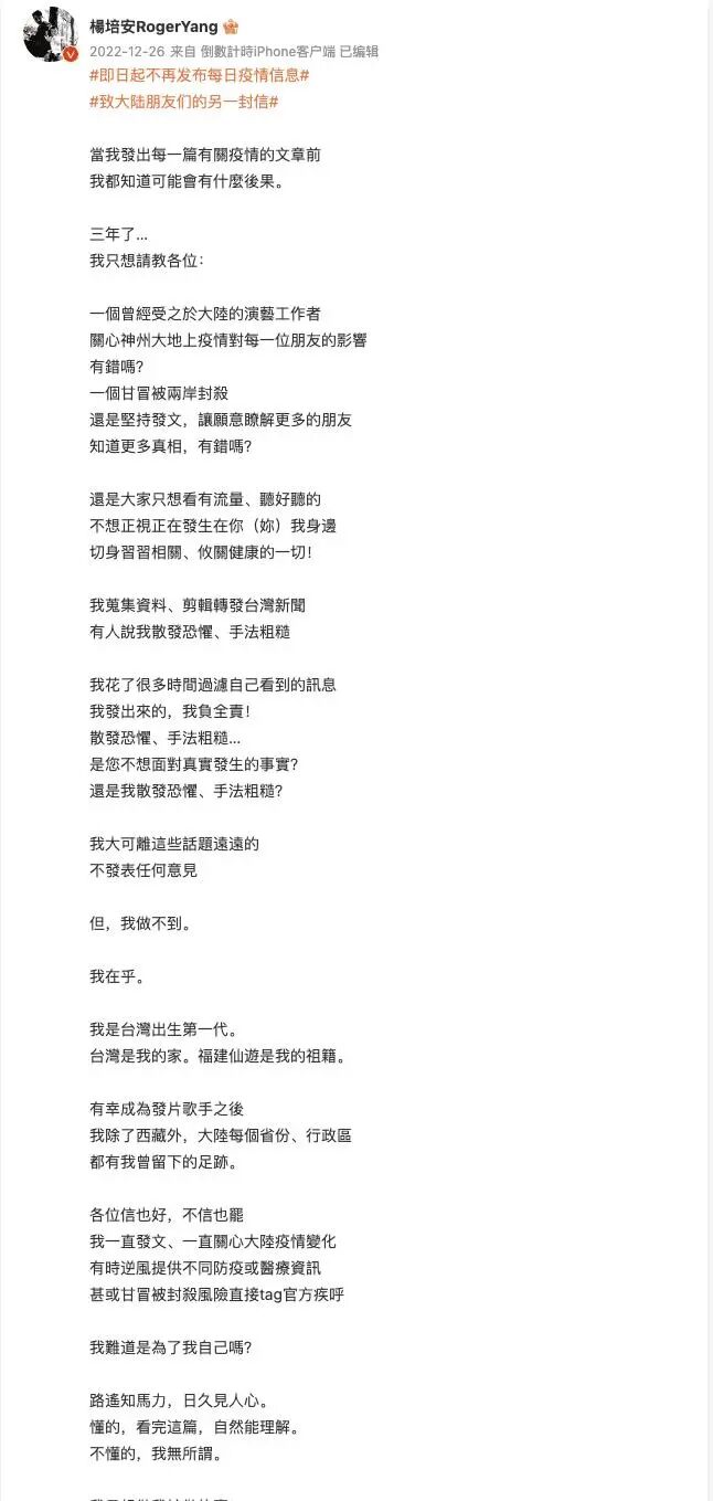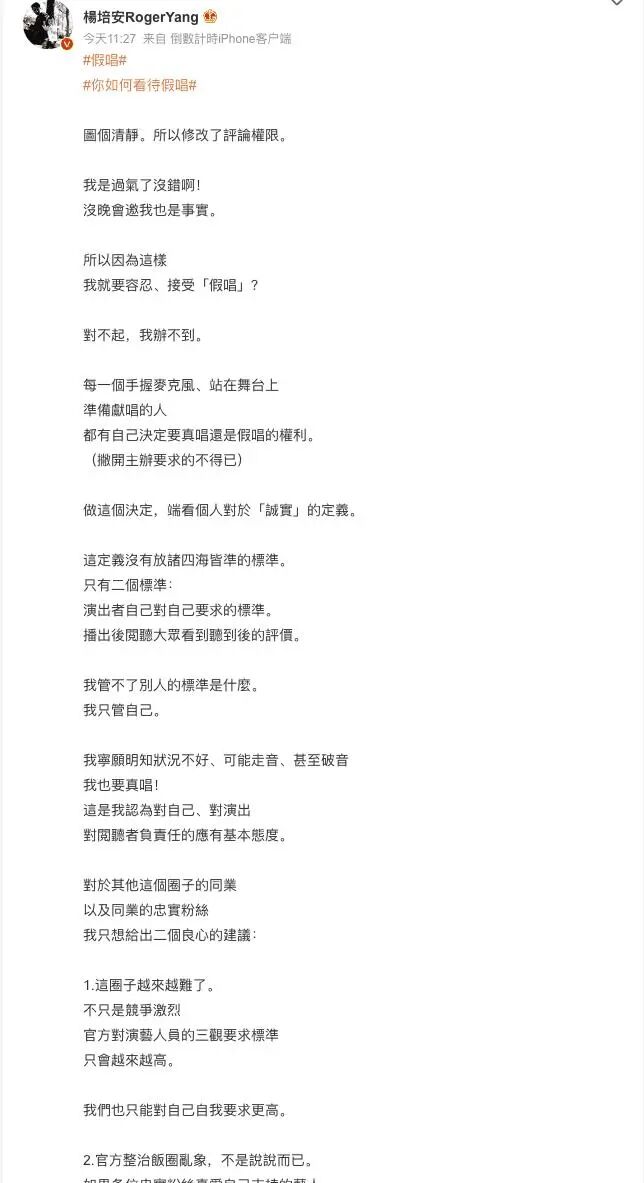 最终,杨培安难堪其扰,不得不关闭了评论区,并再次发布一篇文字,解释了假唱现象背后的原因,劝告粉丝们不要好心做坏事。