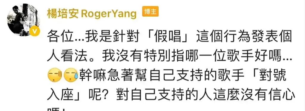杨培安没有指名道姓,却胜似指名道姓,虽然他强调“没有特别指哪一位歌手”,但是大家都知道他在说谁,粉丝也知道。