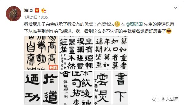 微博中有说到,蛋妞是跟“殷延国”老师学的书法,可能各位小伙伴会有疑问,这位老师是什么来历呢?树人湖笔君早就帮你们查好啦。这位老师1969年生于山东,现居北京。中国书法家协会会员,北京印社社员。毕业于中央美院国画系王镛工作室首届研究生班,师承王镛先生、邱振中先生;现就读于北京凤凰岭书院第二期中国书画学精英班,师承姜宝林先生。曾任《中国美术》杂志编辑,中国书画等级考试主管。任教于中央美术学院继续教育学院,北京师范大学艺术与传媒学院书法系。