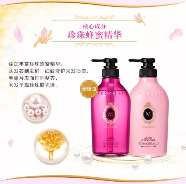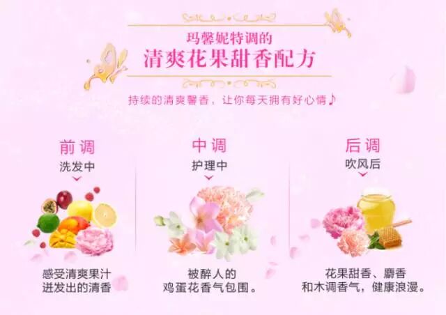 由珍珠贝壳蛋白、蜂蜜、透明质酸、羟乙基脲4大成分构成的玛馨妮莹润保湿成分,层层修护受损发质,充分渗透,让秀发柔顺亮泽直至发梢。