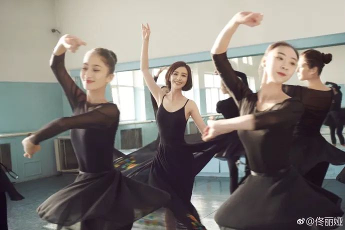 和新疆艺术学院的师妹们共舞的佟丽娅,身着简单黑色长裙,身姿纤细挺拔;