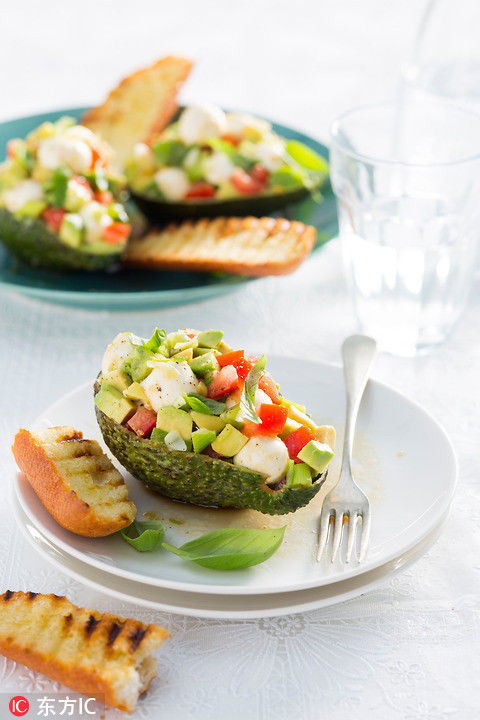 ∆意式鲜酿牛油果三色沙拉,即在牛油果壳里塞入牛油果、番茄丁与乳酪粒