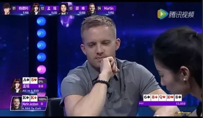 牌面进一步湿润,孟瑶毫不犹豫推出了自己所有记分牌,All-in!MJ稍加思考后弃牌。
