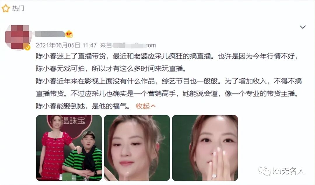 然后陈小春带着妻子开始进军直播行业,用媒体的话说“疯狂搞直播”,应采儿在网友面前滔滔不绝介绍产品,而陈小春大多数都是背景板的存在。