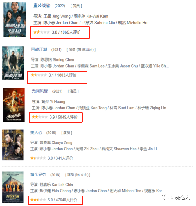 其中口碑最高的是与郑伊健、谢天华等人合体的《黄金兄弟》,“荣获”5分,其他的连4分都没超过,这还没算客串的《四海》。