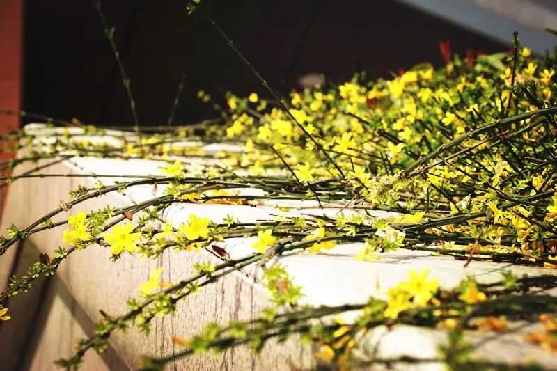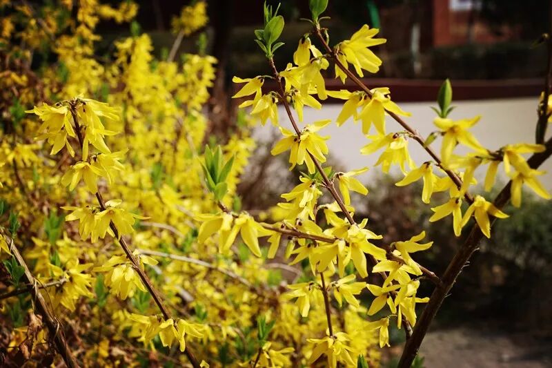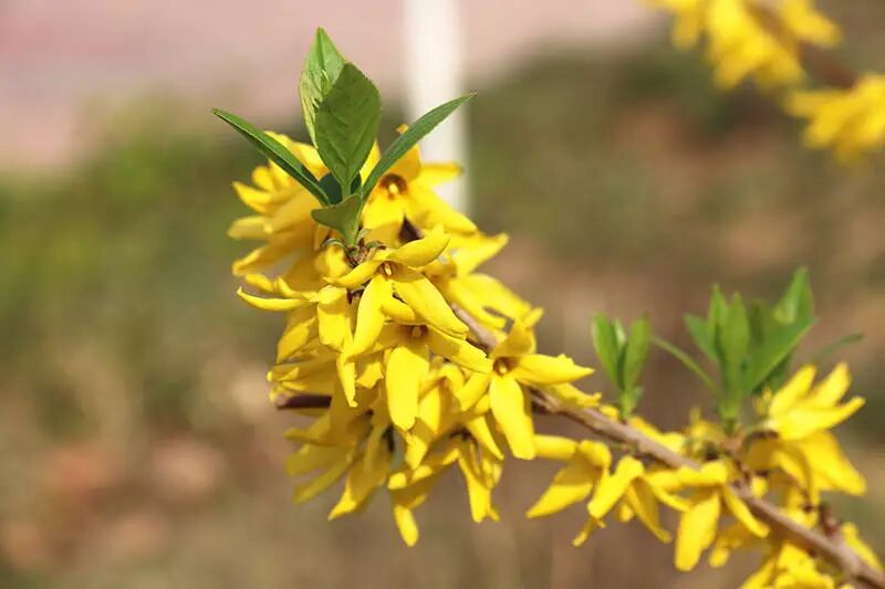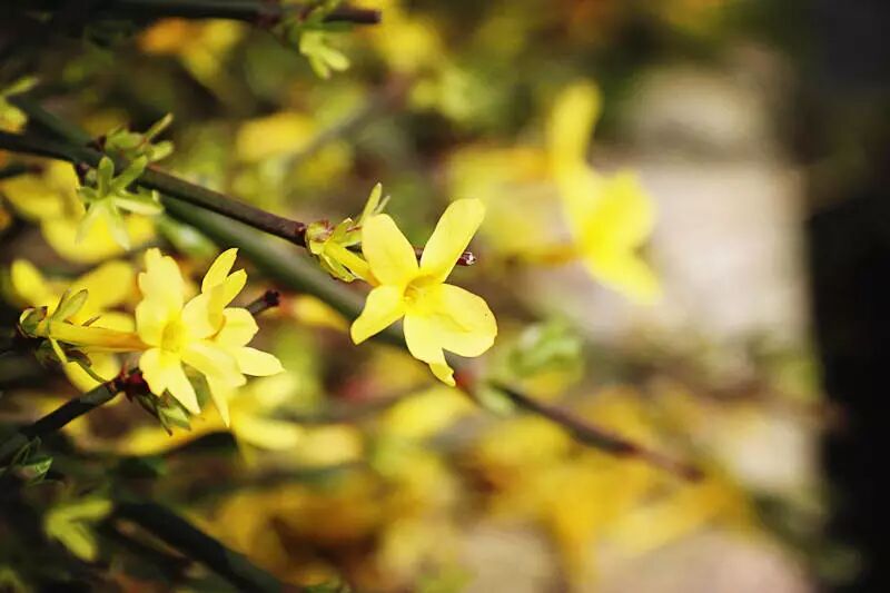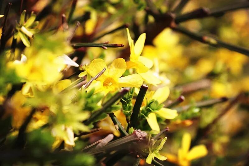 百花园里所看到的大多是红花绿叶,而开黄花的植物则较少,迎春花以珍稀的风采展现于人们的面前,难能可贵。极言迎春花在春寒中独秀一方、独树一帜的超然品格。迎春花在百花之中开花最早,她不仅花色端庄秀丽,气质非凡,具有不畏寒威,不择风土,适应性强的特点。这让人不禁想到,无论严冬酷暑,总能听到莘莘学子们朗朗的读书声;每个清晨操场上充满斗志的奔跑和无数个灯下苦读的夜晚。在青春的征途上,如此积极向上奋斗不息,不正是像迎春花意志般的铁一精神吗?