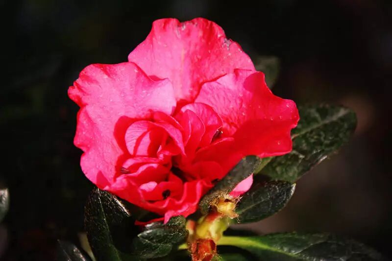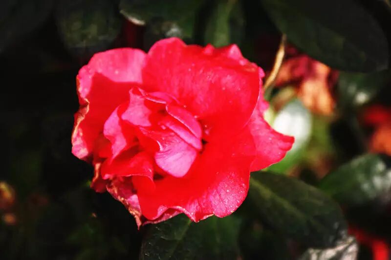 一片片花瓣犹如飘拂轻柔的舞衣,颜色像新装扮的晚宴妆容,细细的枝桠像女子纤细的腰肢。花瓣的颜色由浅至深,已近凋落,落花上沾染了清晨的露水。