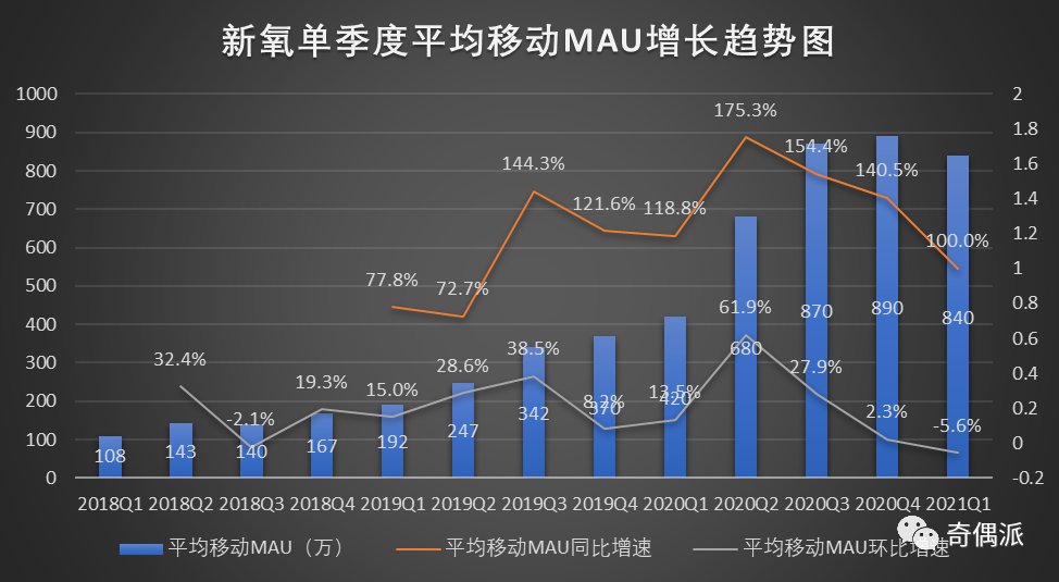 2021年一季度,平均移动MAU同比增长100%,环比下跌5.6%,而这是新氧近2年来,遇到的首次环比下跌,也是单季度跌幅最大的一次。