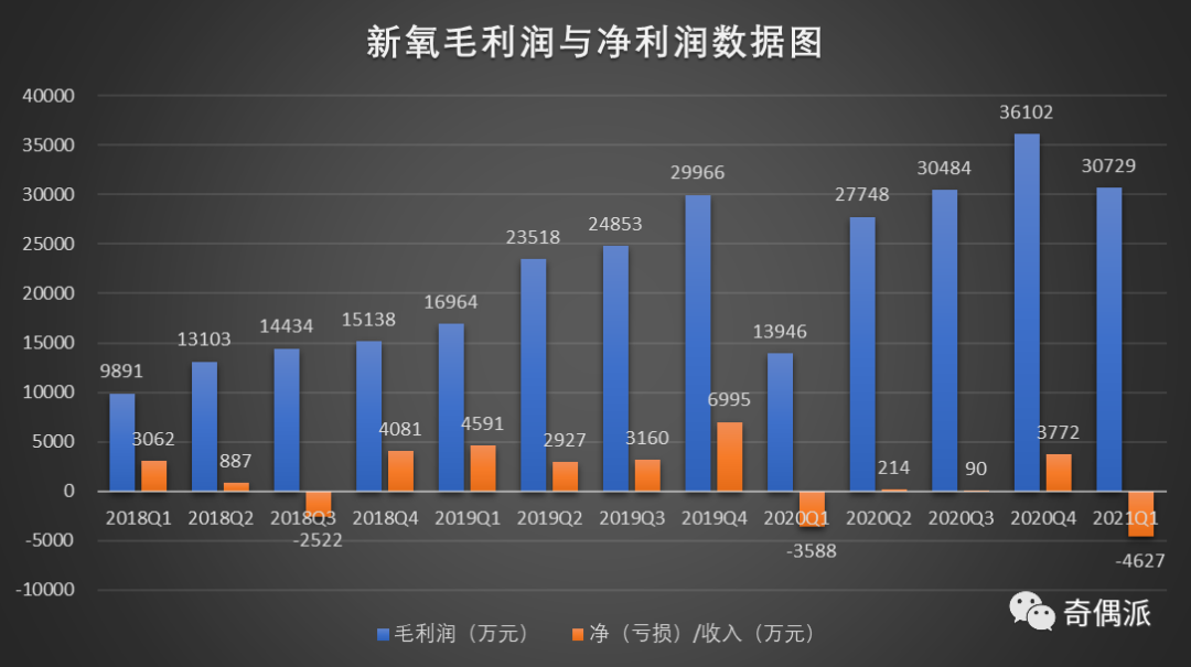 而回到损益表上,2021年一季度,新氧呈现出明显的增收不增利的情况,同样是从加大营销的2020年一季度开始,新氧的总营业收入同比增速不断上涨,2021年一季度同比增长97.1%,同时,毛利润也不断上涨,从2020年一季度的13946万元增至30729万元。