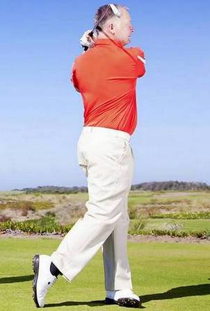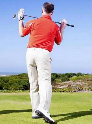 这一动作能够保证球杆从球手前方通过而不滞后于身体,提高击球稳定性。将挥杆看成是一个围绕身体转动的运动,同时身体的上半身要以下半身为基础点而转动,而非平浅的挥杆动作。下杆时保持右肩高度也是一个重点;