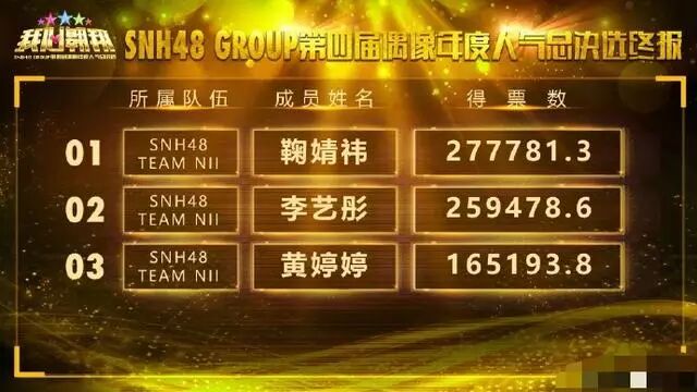 近日,SNH48 GROUP第四届偶像年度人气总决选圆满落幕,结果毫无悬念,鞠婧祎以27万的票数再度摘得了本届桂冠,第二名是李艺彤,总票数25万,黄婷婷摘得第三名,总票数16万!在这里先恭喜三位美少女!