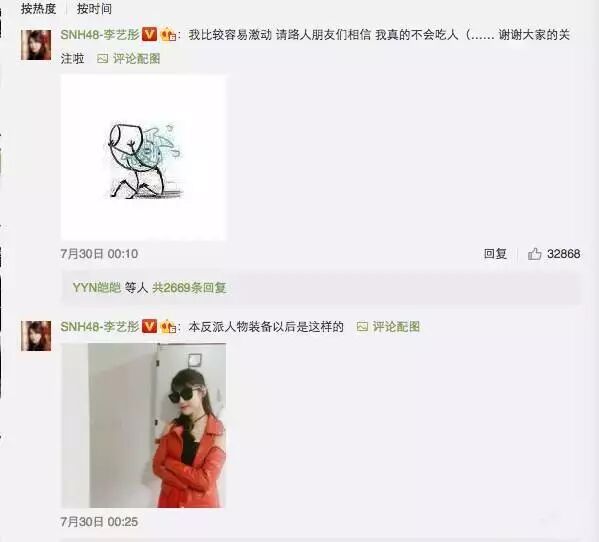 同时在自己微博评论下解释道:我比较容易激动,请路人们相信,我真的不会吃人,谢谢大家的关注!
