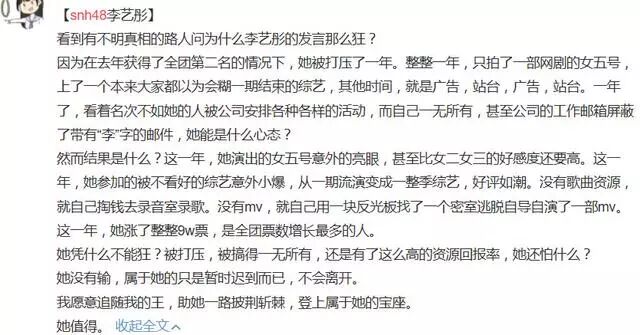 对于李艺彤的这段网友们有“争议”的感言,李艺彤的粉丝发了一条长微博,对此作出了解释,原来在去年李艺彤得了第二之后,被公司打压了一年,只拍了一部网剧的女五号,上了一个很差的综艺,甚至公司的工作邮箱都屏蔽了她,看到这里,才终于明白了李艺彤为什么会把第一看的那么重要了!