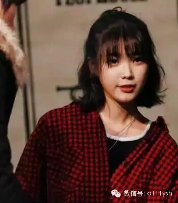 IU的齐刘海短发发尾稍稍卷起,再扎上最近超hit的半丸子头。整个人都显得可爱和甜美哦!