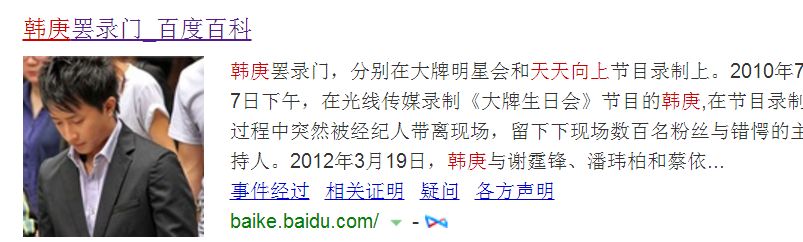 至今还能搜到“韩庚罢录门”事件的百度百科,这对艺人的影响其实是非常不好的。