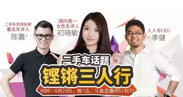 【直播预告】初晓敏、陈震、李健二手车铿锵三人行 人人车 内地男星 2016-06-22 18:22:58 211 创作不易,用心坚持,欢迎请BaGua喝几杯爱心咖啡!打赏并支持本文 打赏并删除本文 【二手车话题 铿锵三人行】:萝卜哥陈震、美女车评人初晓敏、人人车CEO李健 三人共同开播。在线视频直播二手车的那些事儿 在线解答车迷们的问题直播时间:2016年6月23日晚19:00-20:00斗鱼TV萝卜直播间 房间号:614672“名嘴+二手车”强势登陆斗鱼直播节目有美女,有“鲜肉”,有“老司机”为大家呈现一场二手车行业的“锵锵三人行”“ 雷迪斯and乡亲们,是不是很久没有看到好的汽车直播?茶余饭后不知聊点啥了?想即时在线直播看男神、女神和车神?福利马上来了!现有一台重磅好戏!大幕即将拉开,各位看官往下看。老司机要发车了,套路都闪开,只把干货晒,晒一晒都有谁:陈震人称“萝卜哥”,一个追求速度与激情的神级汽车玩家。资深汽车媒体人,汽车改装达人。“从来不买新车,只买二手车”是萝卜哥陈震一贯的玩车风格,他在二手车鉴别和选择方面绝对是老司机。初晓敏国内第一女性车评人,汽车栏目资深主持,肤白貌美气质佳。现主持《优酷试车》、《每周车闻播报》、《晓敏带你看车展》、《超级说明书》等节目,多次对北京车展、上海车展、广州车展进行视频报道。李健人人车CEO,专注于打造最便捷靠谱的二手车C2C交易平台。在和颜宇鹏的访谈节目“ask yyp”中,展现了对二手车市场的细致剖析,和对国内汽车文化的独到见解。这位大拿很懂车,手里有很多高性价比的二手车。“ 预告有福利,现在就可以点击‘’阅读原文‘’进入人人车社区回复,说出你想问他们三位的任何问题,也许他们就可以在直播中点名并回答你们。并且,明天在直播中,多种互动方式均有惊喜礼物送给车友们。这个帖子还会保持图文直播,看不了视频的没关系,我们这里明天见!19:00不见不散哦!----揭开福利活动面纱的分割线----直播活动福利 【活动时间】2016年6月22日-2016年6月24日活动详情【参与方式】:点击本文下方''阅读原文''进入人人车社区回复: 想提问的人+问题,说说最直播的看法和建议在(表扬也可以)。我们将根据大家的回复,选出最有意思的回复,送出我们感谢大家关注的心意噢! 例如:初晓敏:请问你是单身吗? 在2016年6月23日晚19:00-20:00 的斗鱼TV萝卜直播间 (房间号:614672 )中和主播们互动,发弹幕互动或鱼丸等给力打赏,也能得到三位主播给大家即时派发各种特别的礼物。 【奖品设置】人人车礼包整套,至少20名 【公布时间】2016年6月25日下午4点前“ 敬请 期待 ” 点击“阅读原文”快来看直播吧! 创作不易,用心坚持,欢迎请BaGua喝几杯爱心咖啡!打赏并支持本文 打赏并删除本文 感谢您的支持鼓励,我会继续努力的!文章地址:用户邮箱:打赏金额:USDT 请输入数字点击”去打赏“,即可进行打赏支持本文章哦 李健 About the Author 人人车 功能介绍:亲,这里是人人车订阅号,汇集了专业而有趣的二手车知识,脑洞大开的车友见闻,花样百出的选车秘籍,让你每天都涨新姿势!关注一下嘛~么么哒~ Related Posts 【直播预告】初晓敏、陈震、李健二手车铿锵三人行 2016-06-22 18:22:58 新车评YYP对话李健:不关注二手车的创业者不是好车迷! 2016-06-12 19:15:41 发表评论