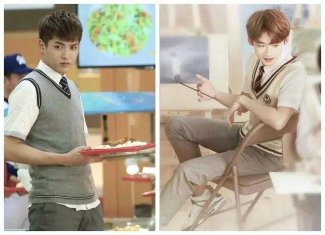 吴亦凡和白敬亭同样是90后当红的小鲜肉,灰色背心针织衫搭配白色短袖衬衫典型的校服装扮,吴亦凡看起来有点壮,而93年的白敬亭给人一种温润阳光的感觉。